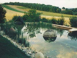schwimmteiche ..ermöglichen im Sommer das Baden in einem natürlichen Gewässer, im Winter Eislaufvergnügen und durch das sich nahezu täglich ändernde Erscheinungsbild das ganze Jahr über neue Perspektiven und Stimmungseindrücke. Ob Schwimm-, Bade-, Kinderteich, kindergerechter Schwimmteich ... die Möglichkeiten der individuellen Gestaltung sind vielfältig: Sprungstein, Insel, Wassergrotte, Springbrunnen, Brücken-, Steganlage, Pavillon, Sitz-, Liegezone, Badehaus, Duschanlage ...